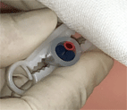 ◯さいたいくんは圧挫しながらを切断するとスムーズです。圧挫しないと「パチン」と音が鳴ります。切断後、キャップを利用してさいたいくんを再度接続して使用できます。